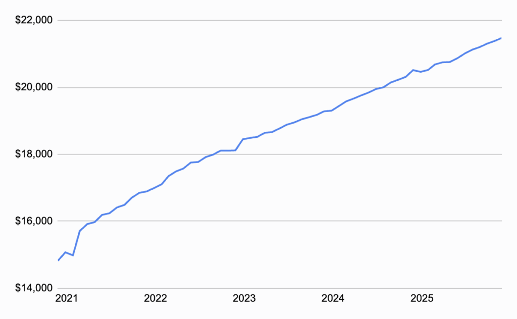 U.S. consumer spending — the primary driver of the economy, spanning everything from food and beverage to housing and utilities — rose 45 percent from December 2020 to December 2025.