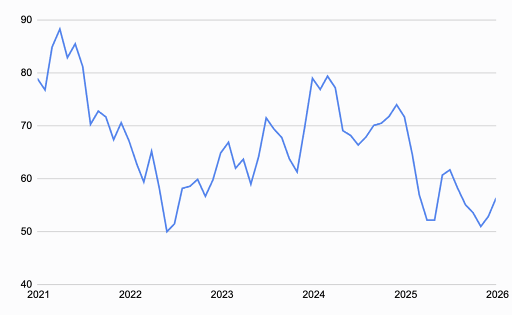 While U.S. consumer sentiment can fluctuate sharply from month to month, an index tracked by the University of Michigan, as of January 2026, remains 29 percent below its January 2021 level.