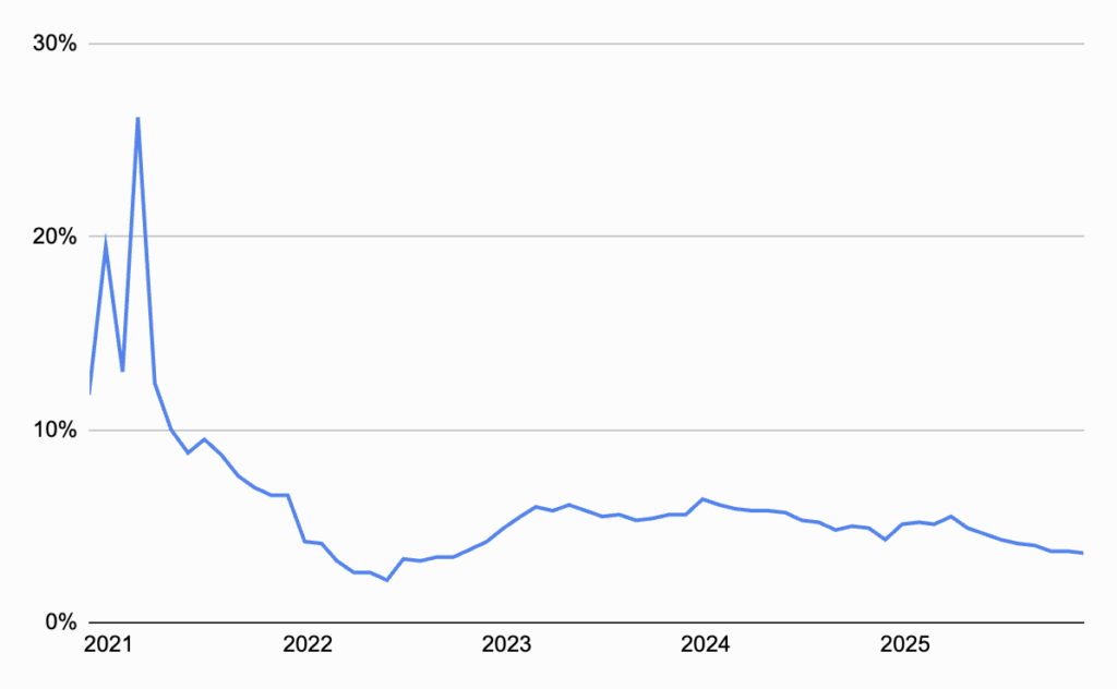 As of Q4 2025, 2.9 percent of U.S. credit card accounts had balances that were at least 30 days past due. While that’s up slightly from the same period in 2020, the figure has trended downward every quarter since Q2 2024, when 3.2 percent of accounts were considered delinquent.