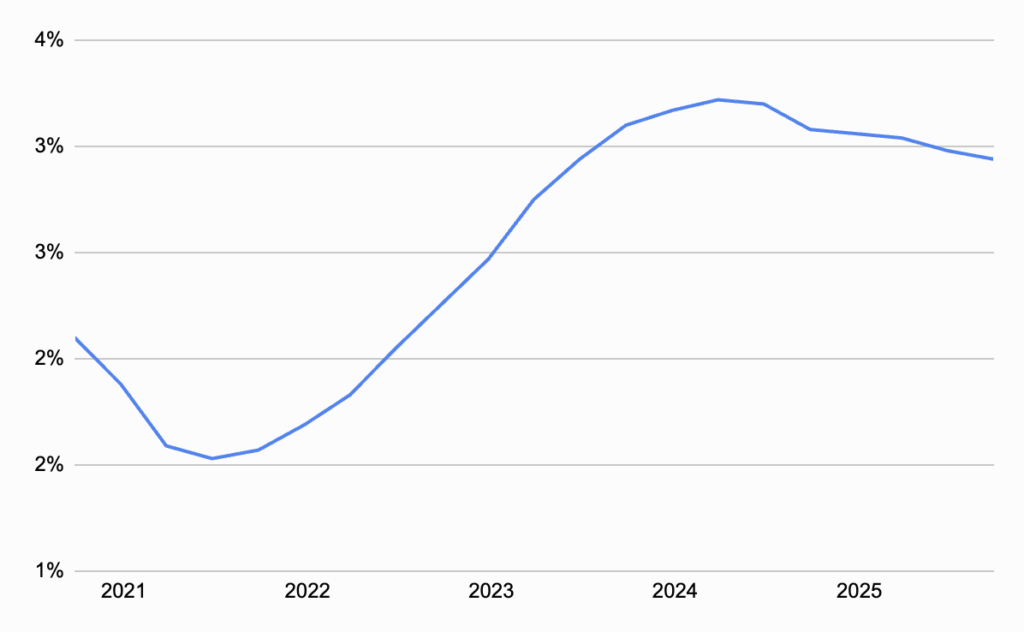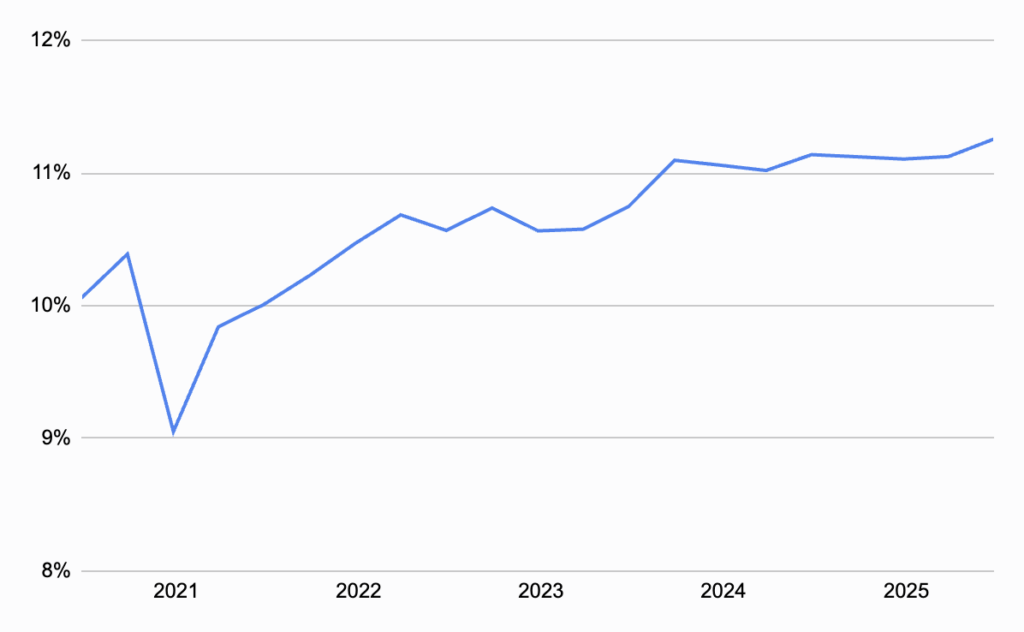 Total U.S. household debt payments, including mortgages and other loans, represented 11.3 percent of disposable income as of Q3 2025, the latest available data — that’s up from 10 percent five years earlier, in Q3 2020.