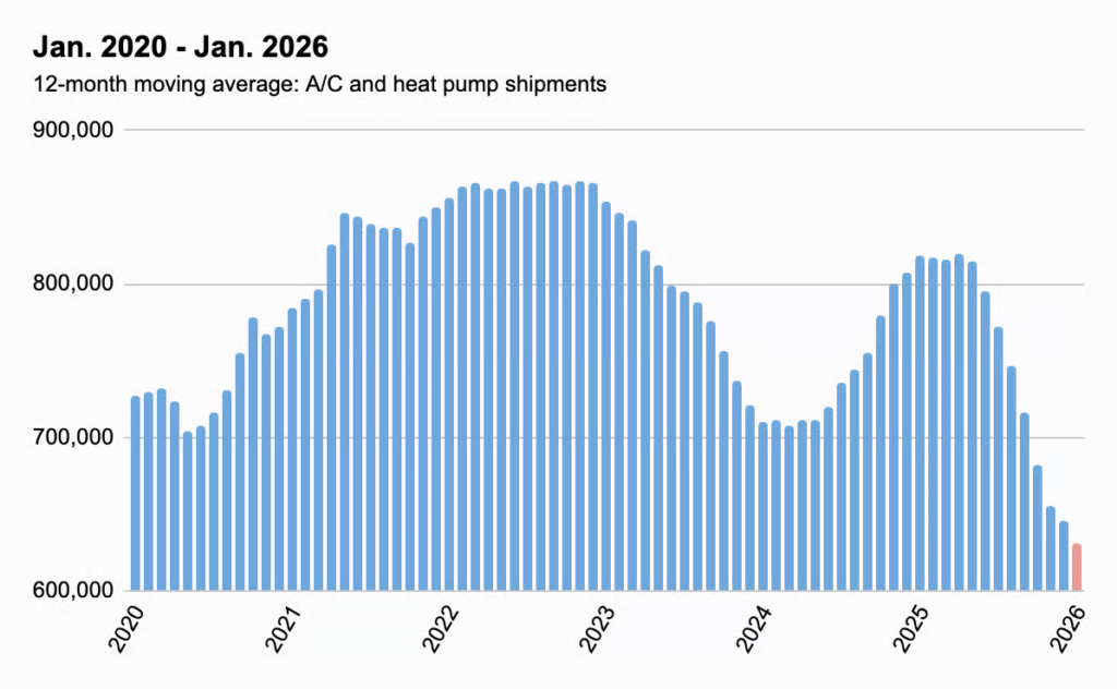The big picture: The release kicks off the new year, following 2025, when total combined A/C and heat pump shipments fell 20 percent compared to 2024, driven in part by pre-buying activity ahead of the January 1, 2025, cutoff for manufacturing R-410A systems, which pushed shipments up double-digits year-over-year throughout the second half of 2024.